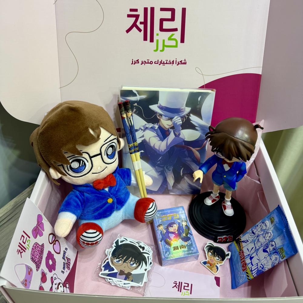 محتويات بوكس المحقق كوناندمية ، مجسم ، 50 قطعة فوتوكارد ، أعواد طعام ، بطاقة حظ ، 50 قطعة ملصقات ، دفتر ، بروش
